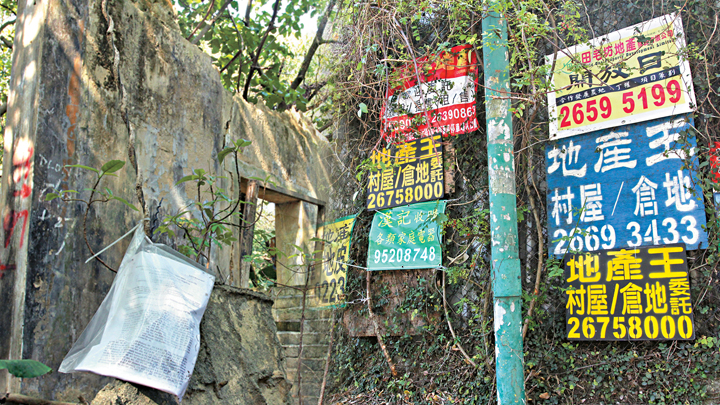 山雞乙村村口掛了十多間收購農地的地產代理廣告,身兼代理的大埔田村村民彭先生說,近期多了來自市區的買家入村物色農地,但東北發展範圍內的地早被大地產商掃空,只餘少量地「有得傾」。