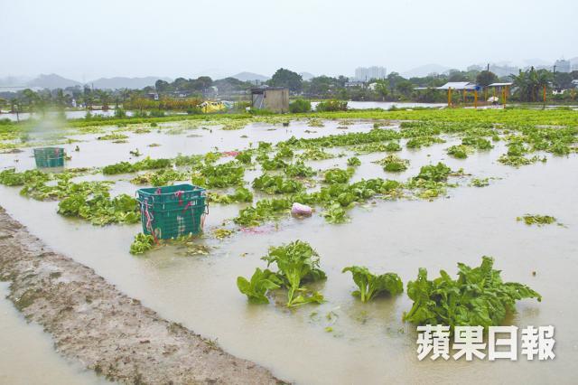 一場冰雹雨將上水燕崗村逾200塊菜田淹沒,新界本地農協會主席黃七娣稱,暴雨警告短時間內「三級跳」,去水渠完全無法疏導積水而倒灌,菜農欲救無從,她估計全村菜農損失達600萬元。