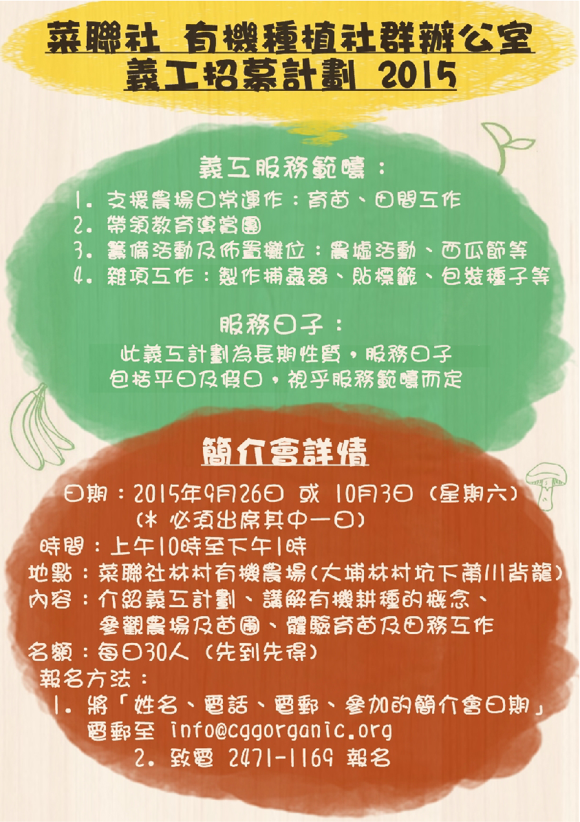 菜聯社現正展開新一輪的「義工招募計劃」!對有機農業或環保教育有興趣的您,請即報名參加 26/9 或 3/10 的義工簡介會!