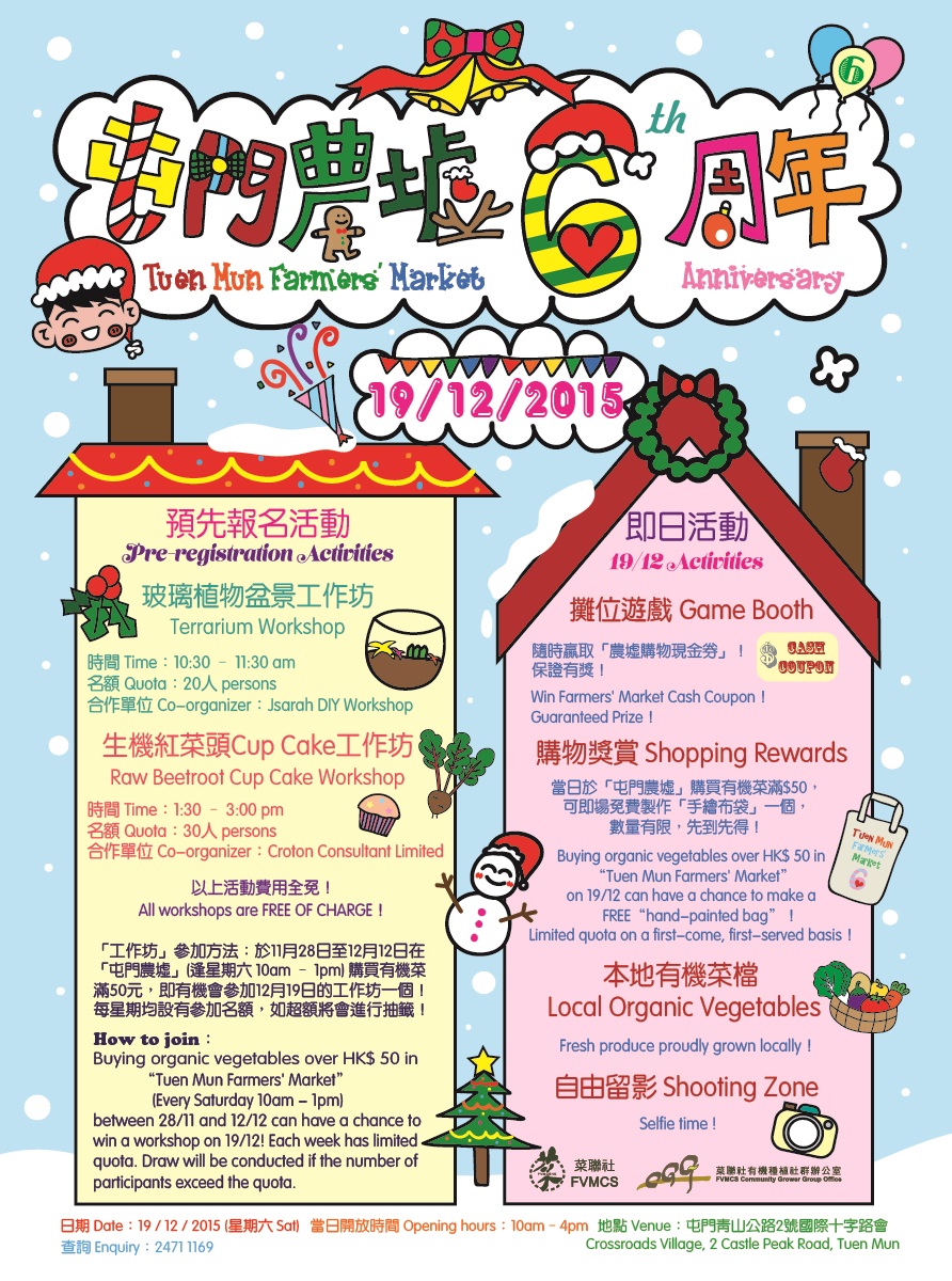 本年將會是屯門農墟最後一年的周年慶祝,為答謝各位的支持,菜聯社將於12月19日 (星期六) 舉行「屯門農墟6周年慶祝活動」,內容包括玻璃植物盆景工作坊、生機紅菜頭Cup Cake工作坊、自由留影,亦有機會免費製作手繪布袋及贏取農墟購物現金券。當然不少得本地有機農友的有機蔬果!