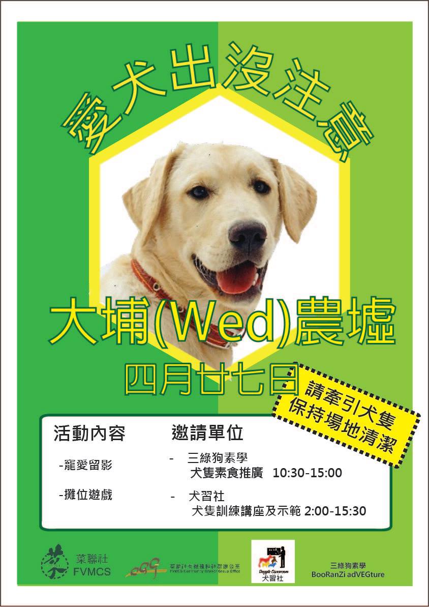 上一頁最新消息 | 星期三大埔農墟 「狗狗節」星期三大埔農墟 「狗狗節」2016年04月13日 星期三大埔農墟將會在4月27日舉辦有關犬隻既特別活動, 內容包括「犬隻素食介紹」、「犬隻訓練」等等, 活動費用全免, 仲可以黎買埋新鮮有機菜。歡迎大家留意稍候公佈我日期,到時帶埋狗狗出席! 上一頁最新消息 | 星期三大埔農墟 「狗狗節」 |