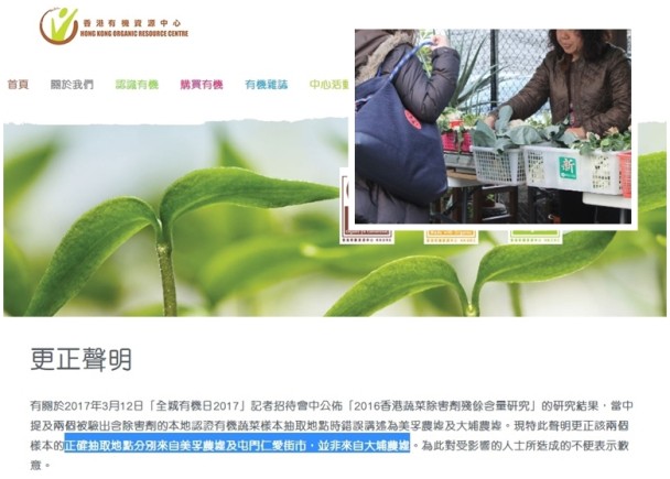 浸大香港有機資源中心於本月12日公布香港蔬菜除害劑殘餘研究報告,以及濕街市販商有機產品銷售實況調查。當中提到有2個獲本地認證有機卻含殘餘農藥的蔬菜樣本,分別來自美孚農墟和大埔農墟。有機資源中心其後於中心網頁刊登更正聲明,提到正確抽取點應為屯門仁愛街市,而非大埔農墟,中心又就事件致歉。