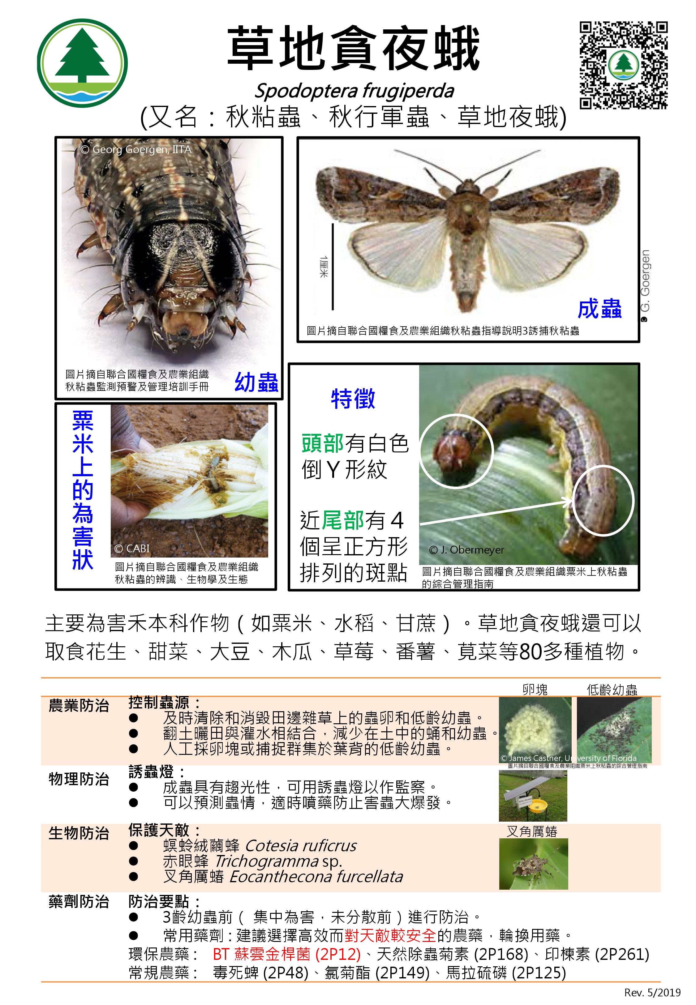 近日一些農作物,例如粟米、水稻、甘蔗等禾本科作物受到嚴重的威脅。因為有一種稱為「糧食殺手」的害蟲「草地貪夜蛾」 (又名秋行軍蟲) 在今年1月中由緬甸經雲南傳入中國,不到5個月就擴散到至少18個省市,蔓延速度非常迅速,而且最近更攻入香港。根據漁護署證實,於5月30日在上水大龍實驗農場種植的粟米上發現草地貪夜蛾的卵塊、一齡及二齡階段幼蟲,及於6月10日接獲一個位於大埔的農場的發現個案。