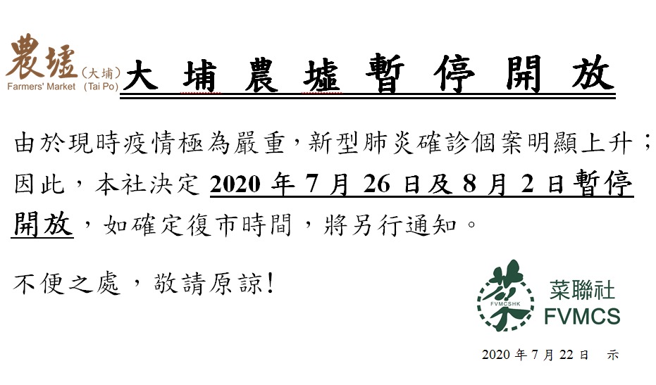 由於現時疫情極為嚴重,新型肺炎確診個案明顯上升,因此,本社決定2020年7月26日及8月2日暫停大埔農墟開放。如確定復市時間,將另行通知。
