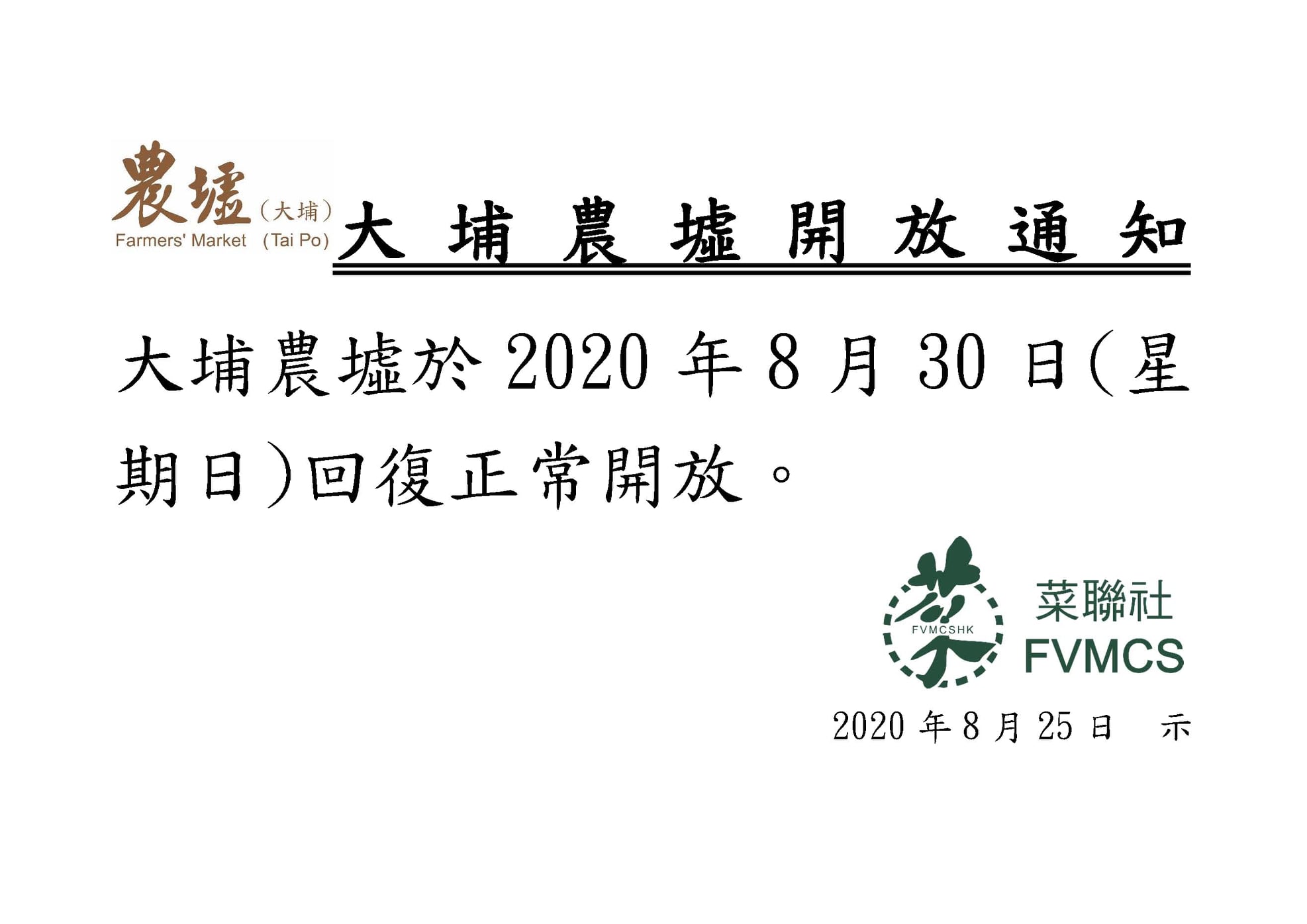 大埔農墟於8月30日(星期日) 回復正常開放。