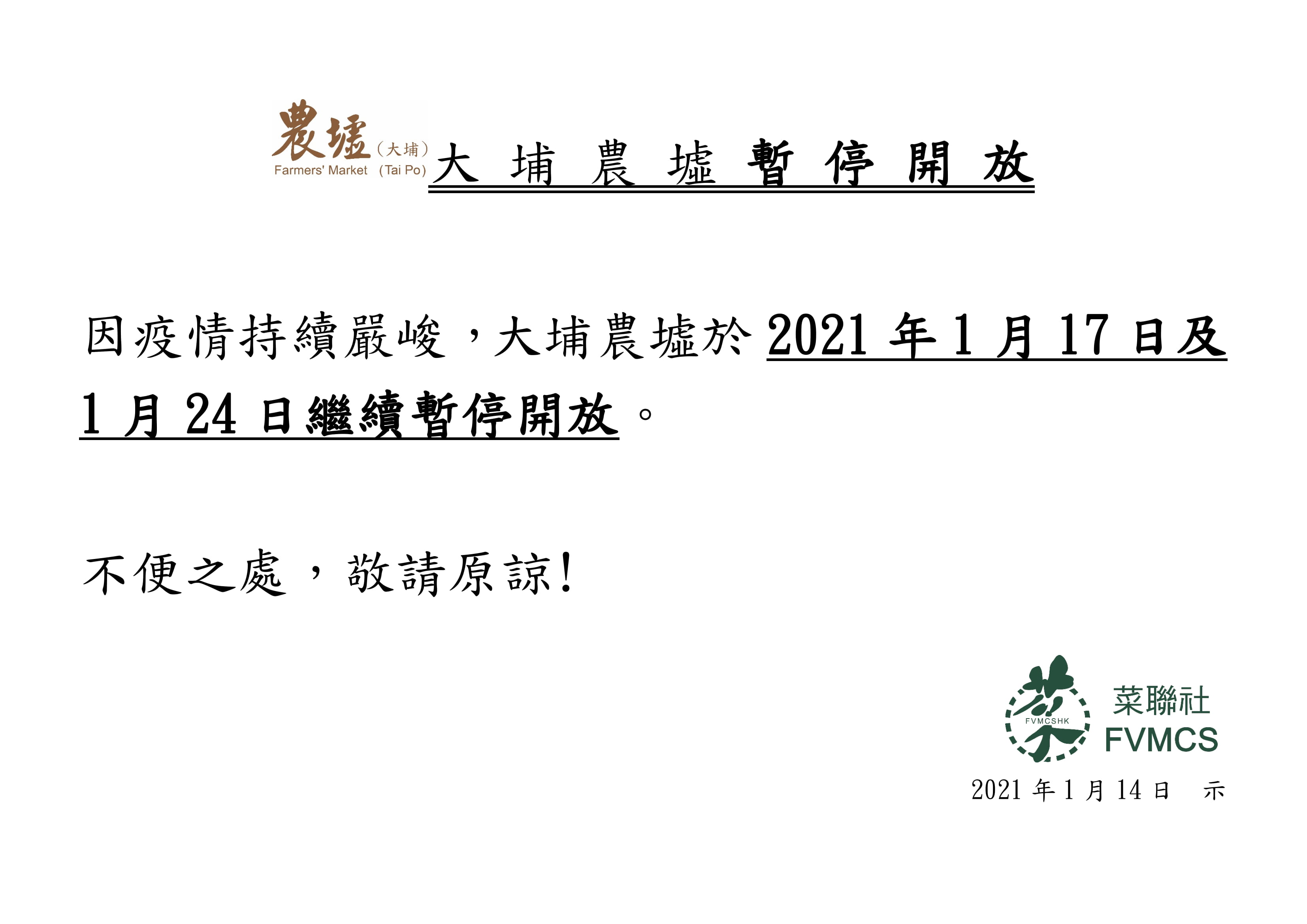 因疫情持續嚴峻,大埔農墟於2021年1月17日及1月24日繼續暫停開放。