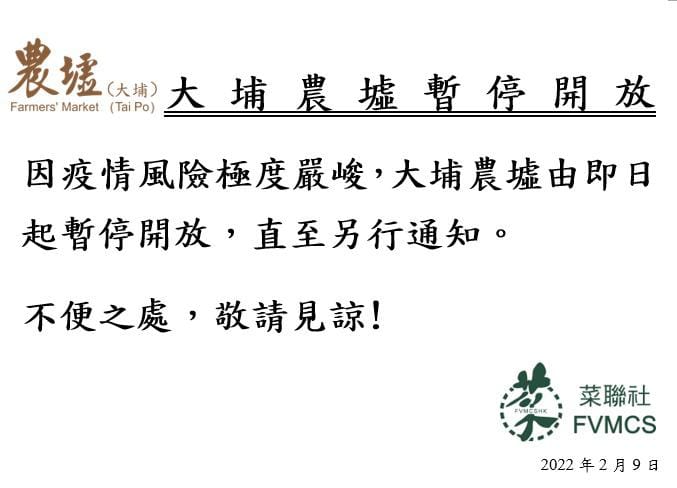 因疫情風險極度嚴峻,大埔農墟由即日起暫停開放,直至另行通知。