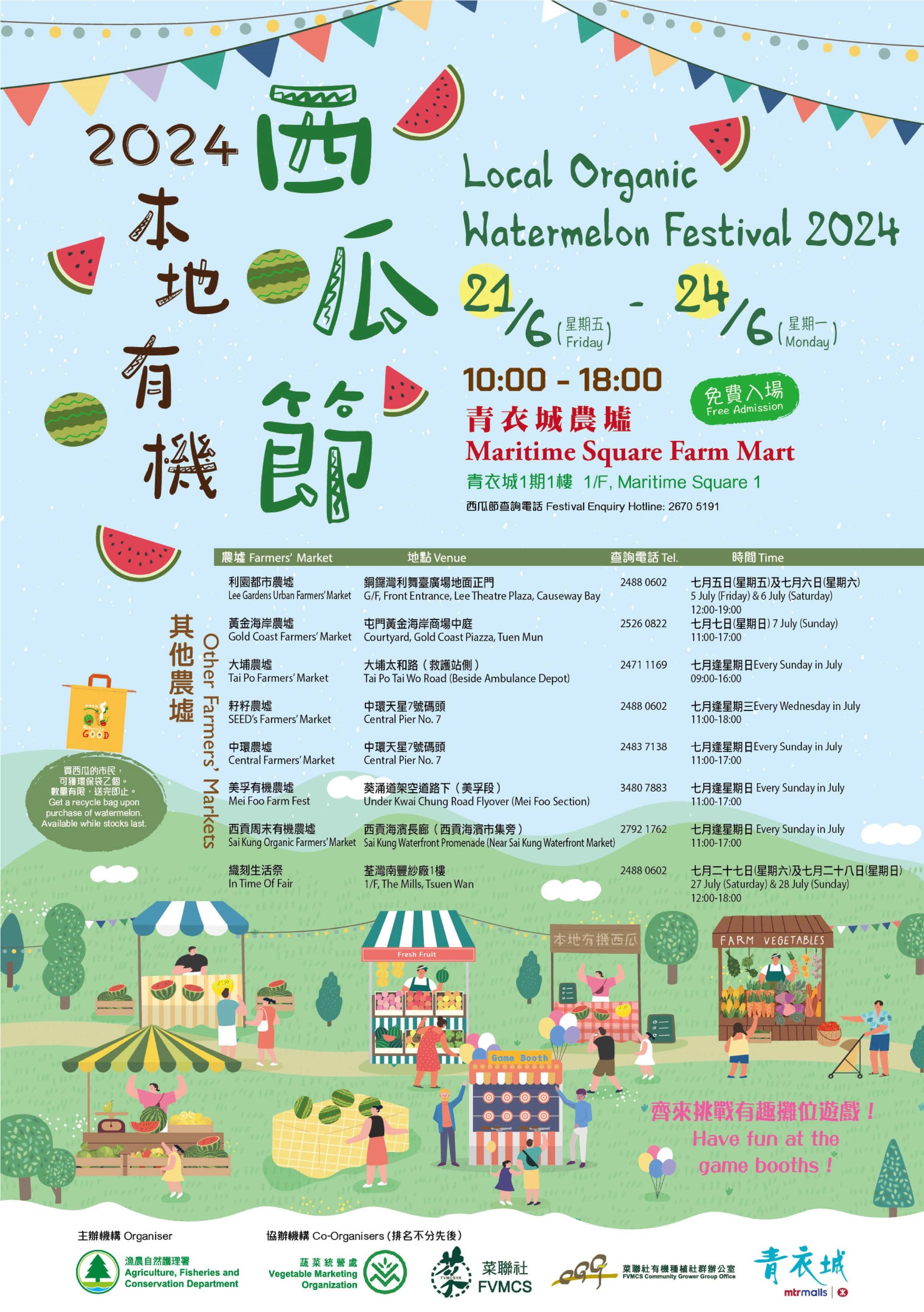 2024年本地有機西瓜節會喺6月21日至24日舉行,地點喺青衣城,歡迎各位市民屆時去選購,支持本地農業