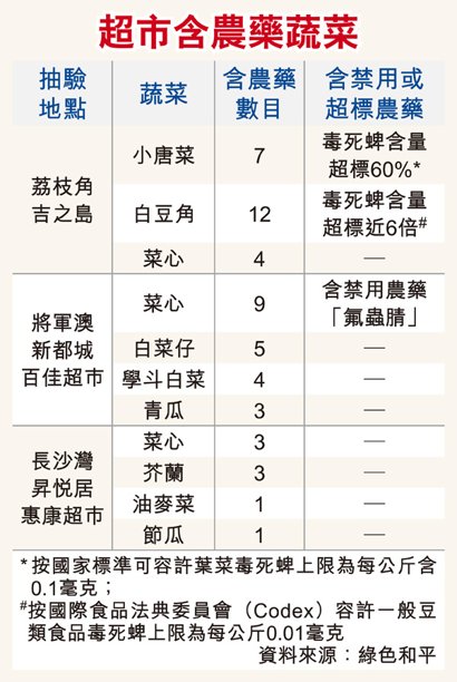 上一頁最新消息 | 環團揭3大超市 蔬菜含農藥環團揭3大超市 蔬菜含農藥2012年05月18日 綠色和平抽驗本港3大超巿蔬菜樣本,包括吉之島、百佳和惠康,92%樣本含農藥,百佳菜心更含禁用農藥「氟蟲腈」,吉之島白豆角和小唐菜含「毒死蜱」,分量分別超標近6倍和60%;吉之島昨宣布回收白豆角。調查亦發現,內地供港菜場日日在農場灑農藥,連水源都含禁用農藥。 上一頁最新消息 | 環團揭3大超市 蔬菜含農藥 |